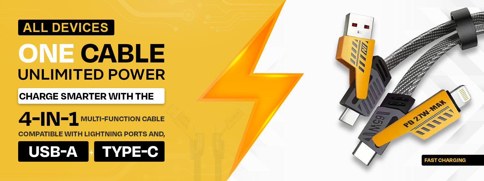 4-in-1 Fast Charging Cable | 65W Smart Power Cord (Type-C, USB, Lightning)