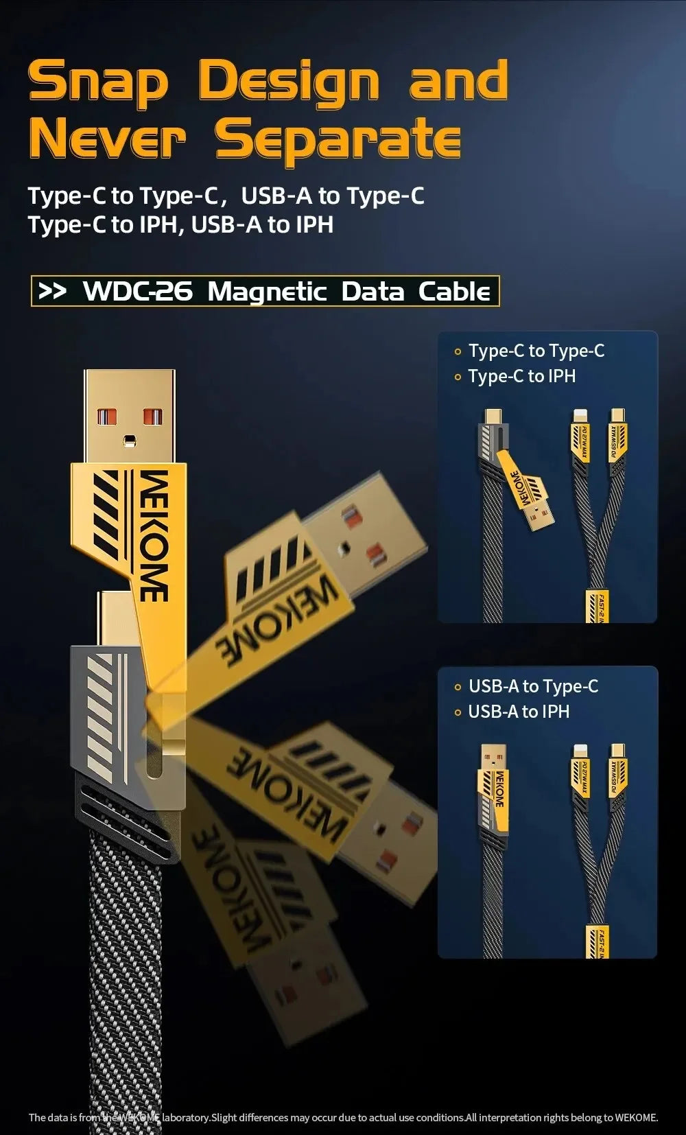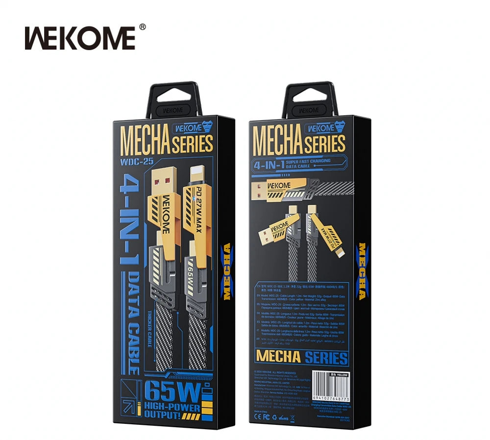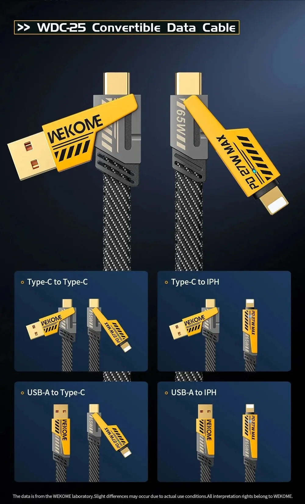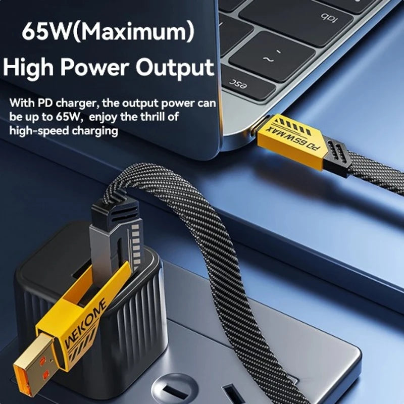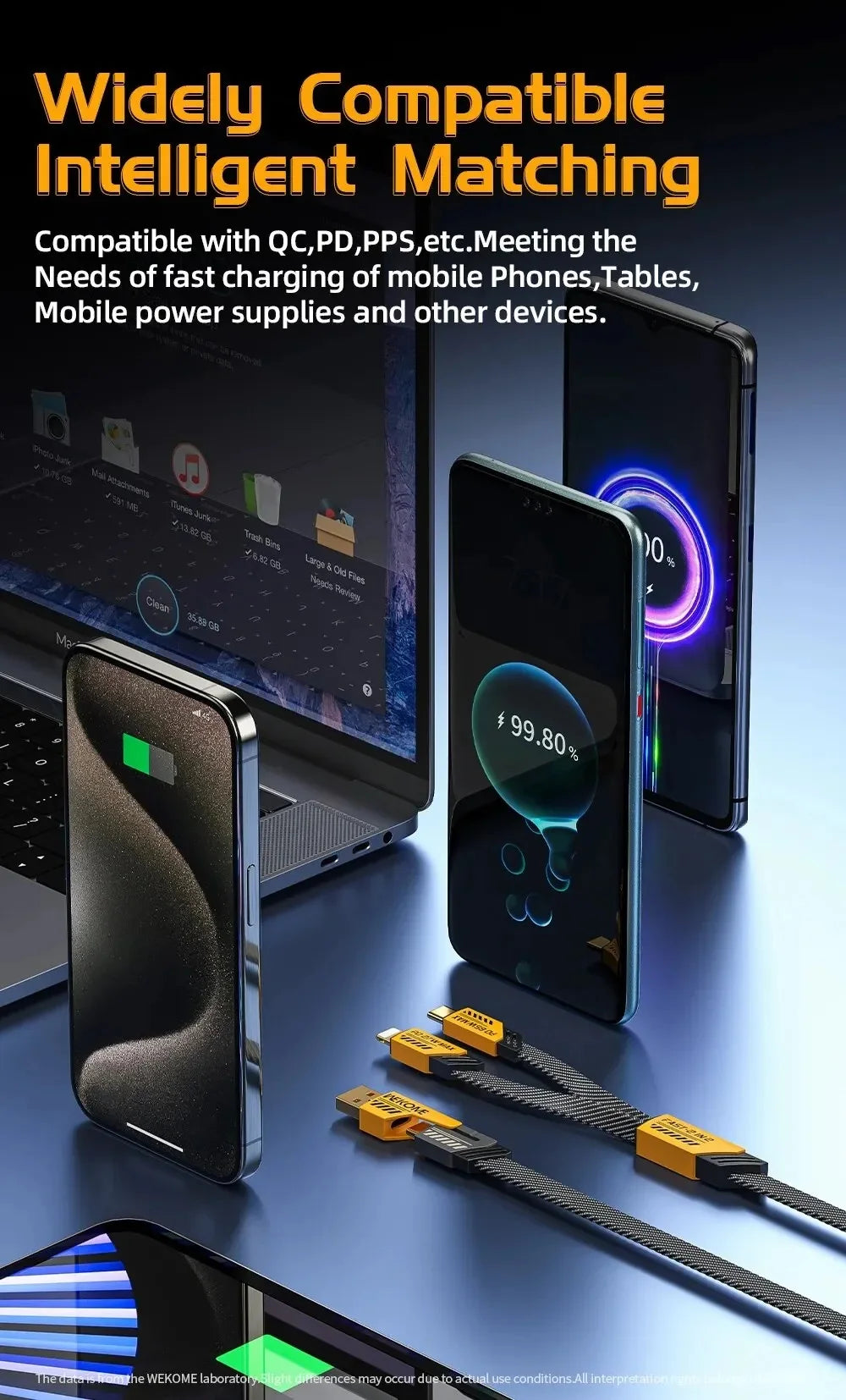 Meet the WEKOME 4-in-1 Fast Charging Cable, your all-in-one solution for powering up phones, tablets, laptops, and more. Built with a smart chip, tangle-free braided design, and 65W ultra-fast charging power, this cable is made to keep up with your lifestyle.